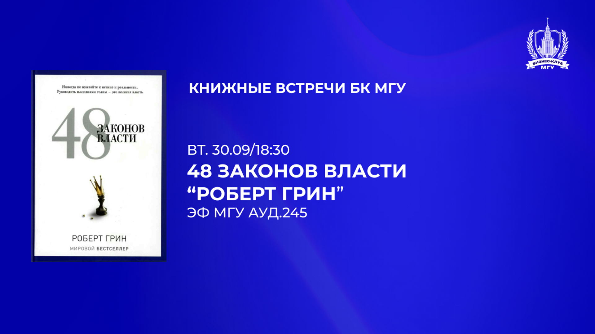 Книжный клуб БК МГУ приглашает на встречу по книге Роберта Грина «48 законов власти» — одной из самых обсуждаемых книг о влиянии, лидерстве и человеческой природе.